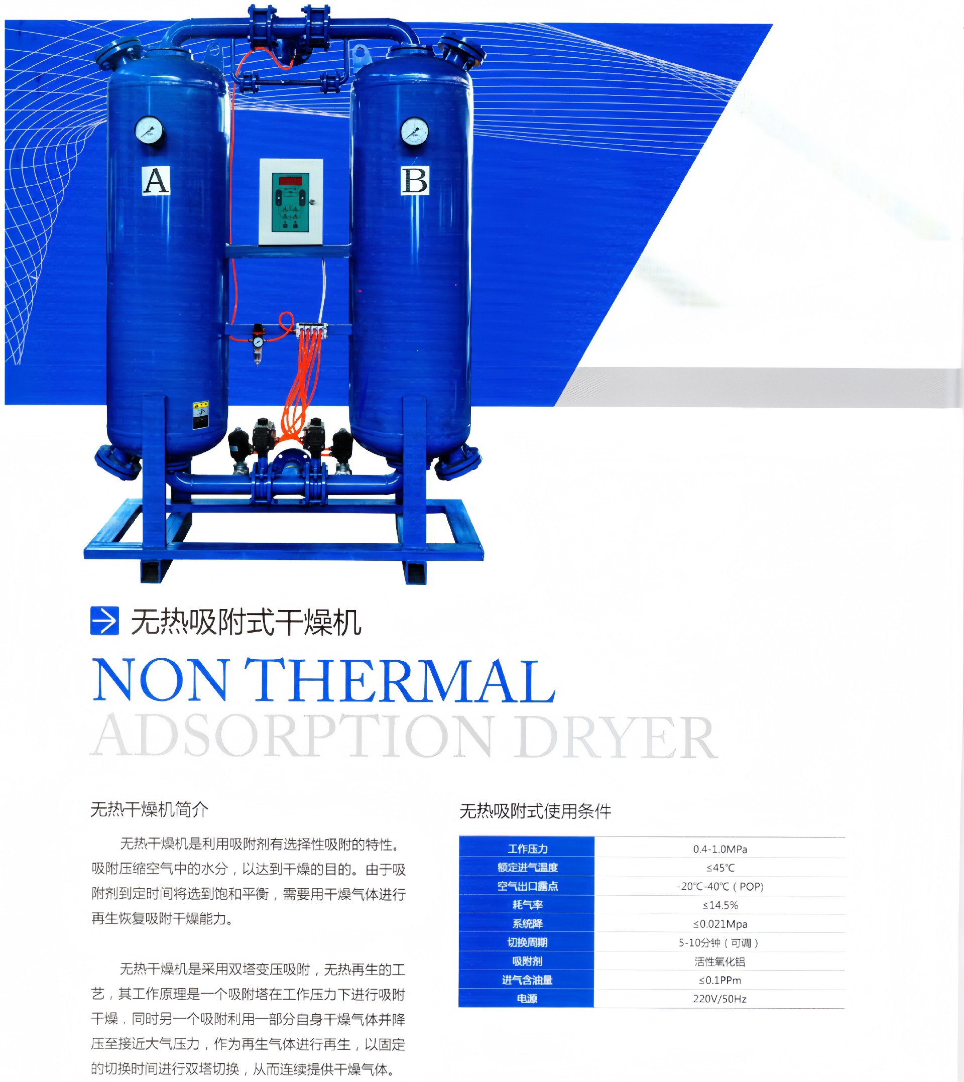 产品描述:无热再生吸附式干燥机是利用“变压吸附”来达到干燥效果的。由于空气容纳水汽的能力与压力成反比,其干燥后的一部分空气(称为再生气)减压膨胀至大气压,这种压力变化使膨胀空气变得更干燥,然后让它流过未接通气流···